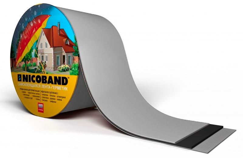 Герметизирующая лента Никобaнд (NICOBAND) получают путем одностороннего нанесения на фольгированною УФ — стойкую пленку самоклеящегося битумно-полимерного вяжущего, состоящего из битума, полимерного модификатора и специальных адгезионных добавок.