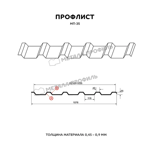 Профлист МЕТАЛЛ ПРОФИЛЬ МП-35x1035-B (VikingMP E-20-6007-0,5) — популярный материал для обустройства профилированного листа. Изначально он представляет собой лист оцинкованной стали с покрытием. Толщина металла с оцинковкой и декоративно-защитным покрытием составляет 0.5 мм. Проходя процедуру холодного проката, сталь приобретает рисунок из ритмичных волн. Такая конфигурация придает профилю несущую способность.Профиль МП-35: